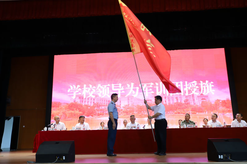 典礼最后,学校党委吴志强副书记为军训团授旗,军训团副团长邹志友代表军训团接受授旗。