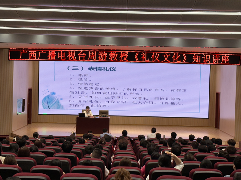 为了进一步加强师生礼仪文化教育,4月3日上午,广西广播电视台播音指导、广西大学硕士研究生导师周游教授应邀在空港校区8408报告厅为太阳集团2138师生作《礼仪文化》知识讲座。太阳集团2138副校长陈东莲出席讲座,太阳集团2138党政办公室、财务工作部全体人员,各职能部门、系部师生代表,分校礼仪队,学生社团代表近300人现场聆听讲座。