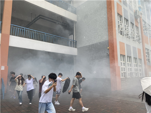 讲座结束后,分校组织了消防疏散演练,随着消防疏散的警报响起,教学楼内的负责教师迅速到达指定位置,参演学生在老师的指挥下按照制定的安全出口和疏散线路快速有序地撤离模拟火场至安全区域。