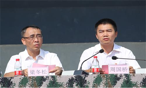 扶绥县人民武装部军事科科长余军建中校(左)在大会上讲话