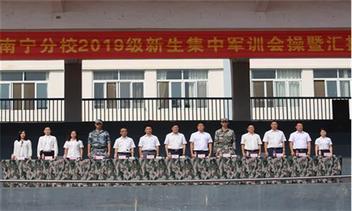 学校党委副书记王赣华(前排中)在扶绥县人民武装部军事科科长余军建中校,中国人民解放军95339部队杨智超中校陪同下检阅军训队伍