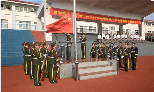 大会在高亢嘹亮的国歌声中拉开序幕。迎军训团团旗后,学校党委副书记王赣华,在扶绥县人民武装部军事科科长余军建中校,中国人民解放军95339部队杨智超中校陪同下,检阅军训队伍,向参训学生致以亲切的问候。“同学们好”、“领导好”、“同学们辛苦了”、“为校争光”的口号声此起彼伏,响彻桂工空港校园。