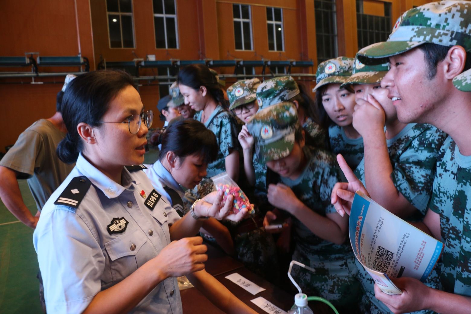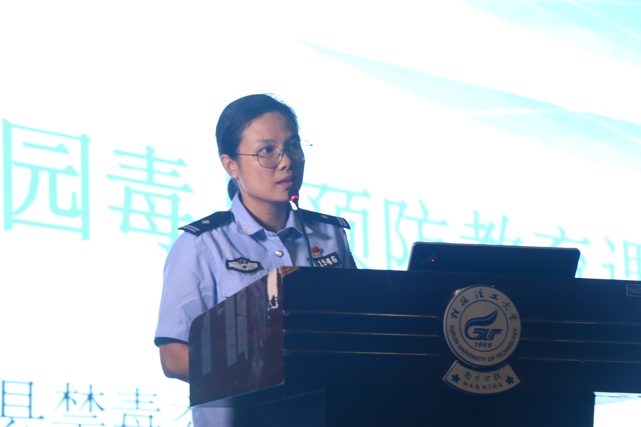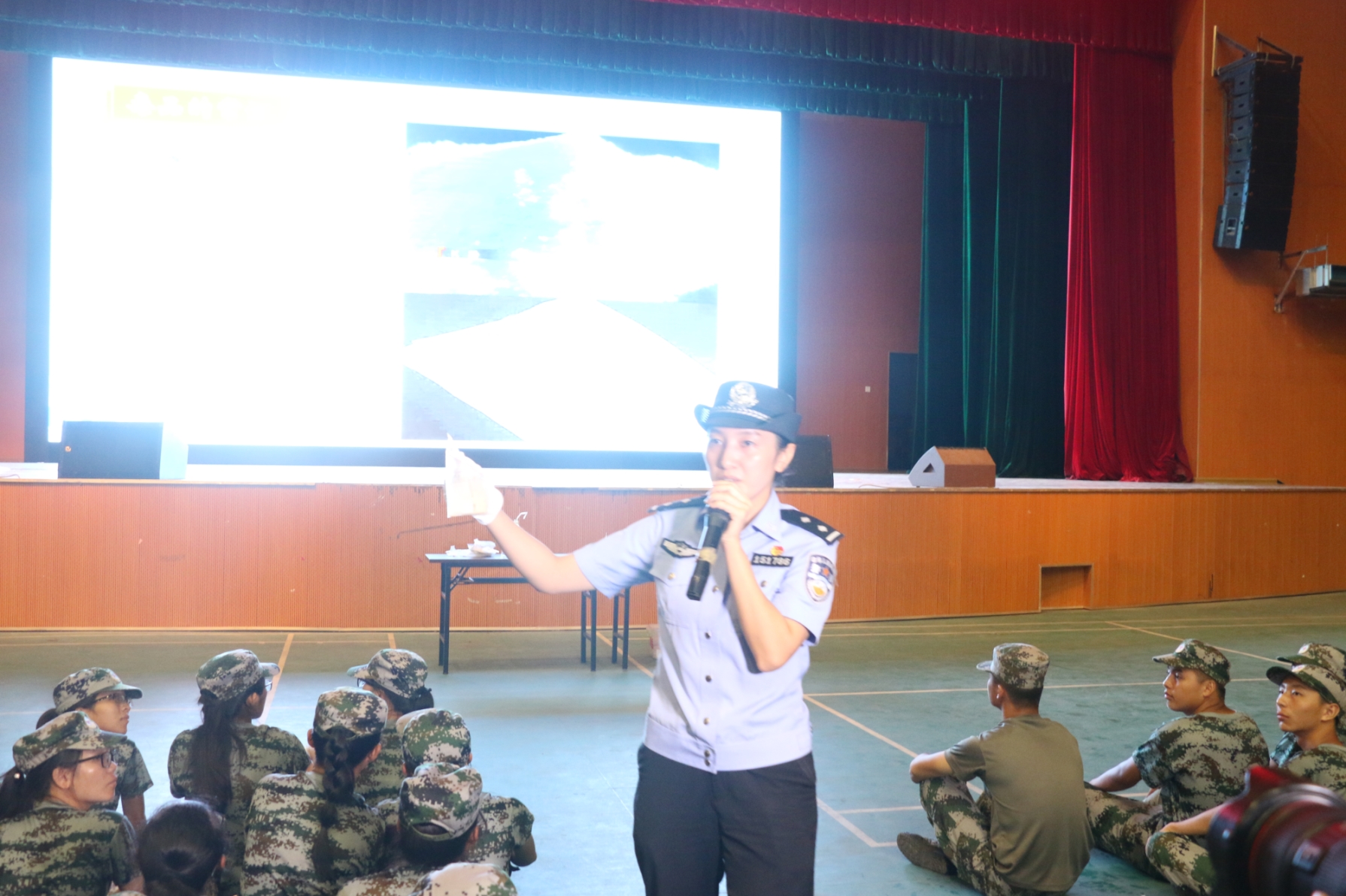 | | 9月19日晚,分校在空港校区体育馆举办了“开学第一课”毒品预防知识讲座。讲座邀请了扶绥县禁毒办副主任韦桃作专题报告。扶绥县公安局禁毒大队民警、扶绥县禁毒志愿者、分校保卫工作部负责人及全体军训团教官、师生参加讲座。