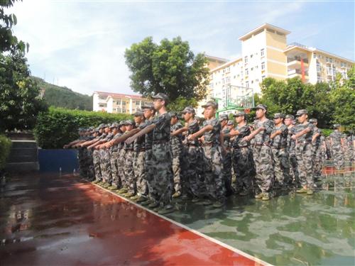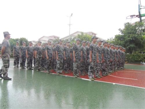 集合、看齐、立正、稍息,在阳光的洗礼中,新生们昂首挺胸,以笔直的军姿迎接教官们的审阅。当他们的内心抱怨着要休息,想要放弃的时候,在教官的鼓舞下,又咬紧牙关,继续与烈日抗争,与高温搏斗。就算是身体羸弱的同学,万不得已休息一会,又立马上阵;就算是汗水流进眼睛里,依然坚持不懈。可敬的教官亲自为同学们整理衣襟,学生们不禁油然而生出崇高的敬意与感动之情,就更加挺直了腰板,他们在洒满汗水与泪水的训练场上刻下青春无敌的飒爽英姿,在烈日下锻炼着钢铁般的意志。