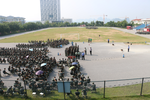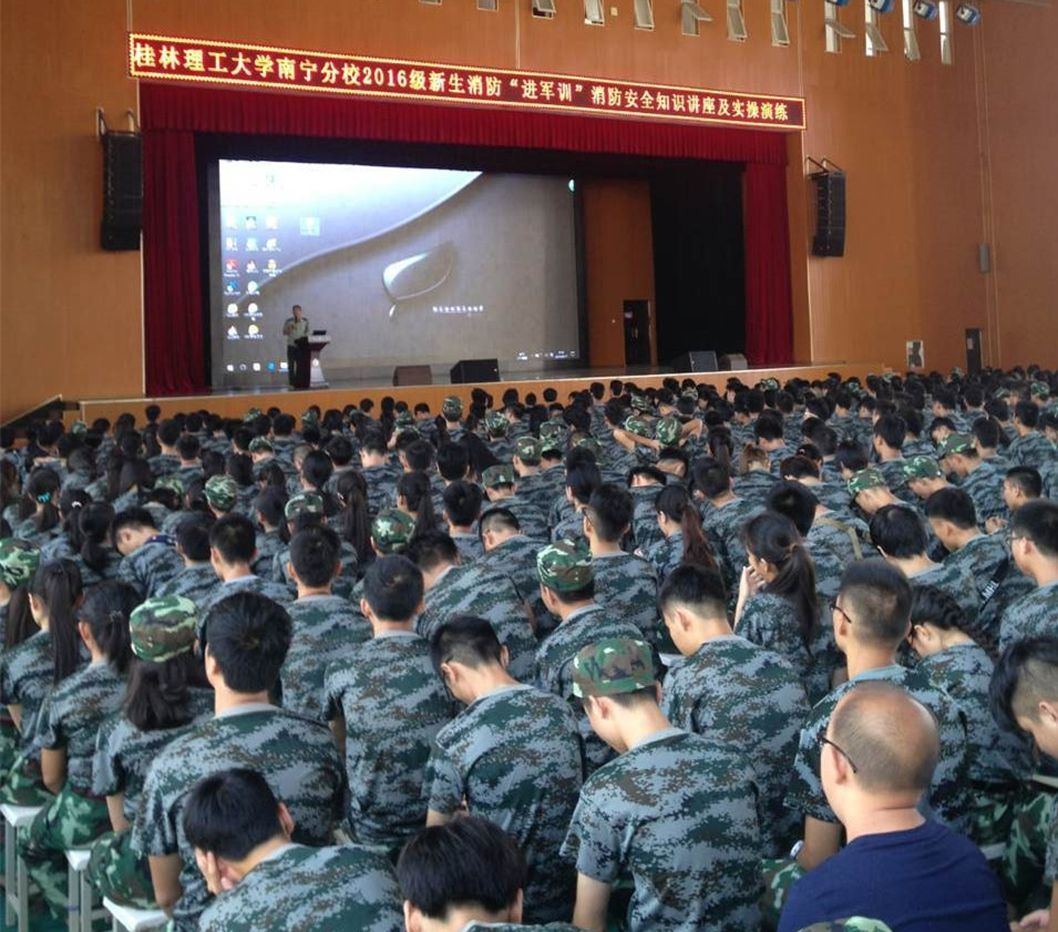 在体育馆内,扶绥县消防大队宣传员谭立结合高校消防工作的特点和典型火灾案例,运用通俗易懂、贴近生活的语言向军训新生阐述了校园消防安全的重要性,讲授了日常生活中火灾预防的措施和要求,传授了初起火灾处置和火场逃生的方法和要点。