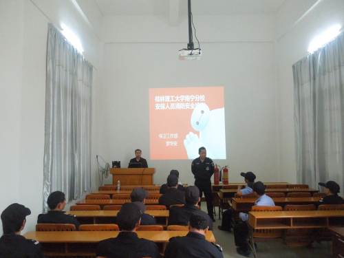 首先,罗华安同志在安保综合培训室进行消防理论知识,通过全国各地消防案例为切入点,结合我校消防工作的具体情况进行理论知识培训。然后,在实训楼东面安保队员进行灭火器实际操作演练。