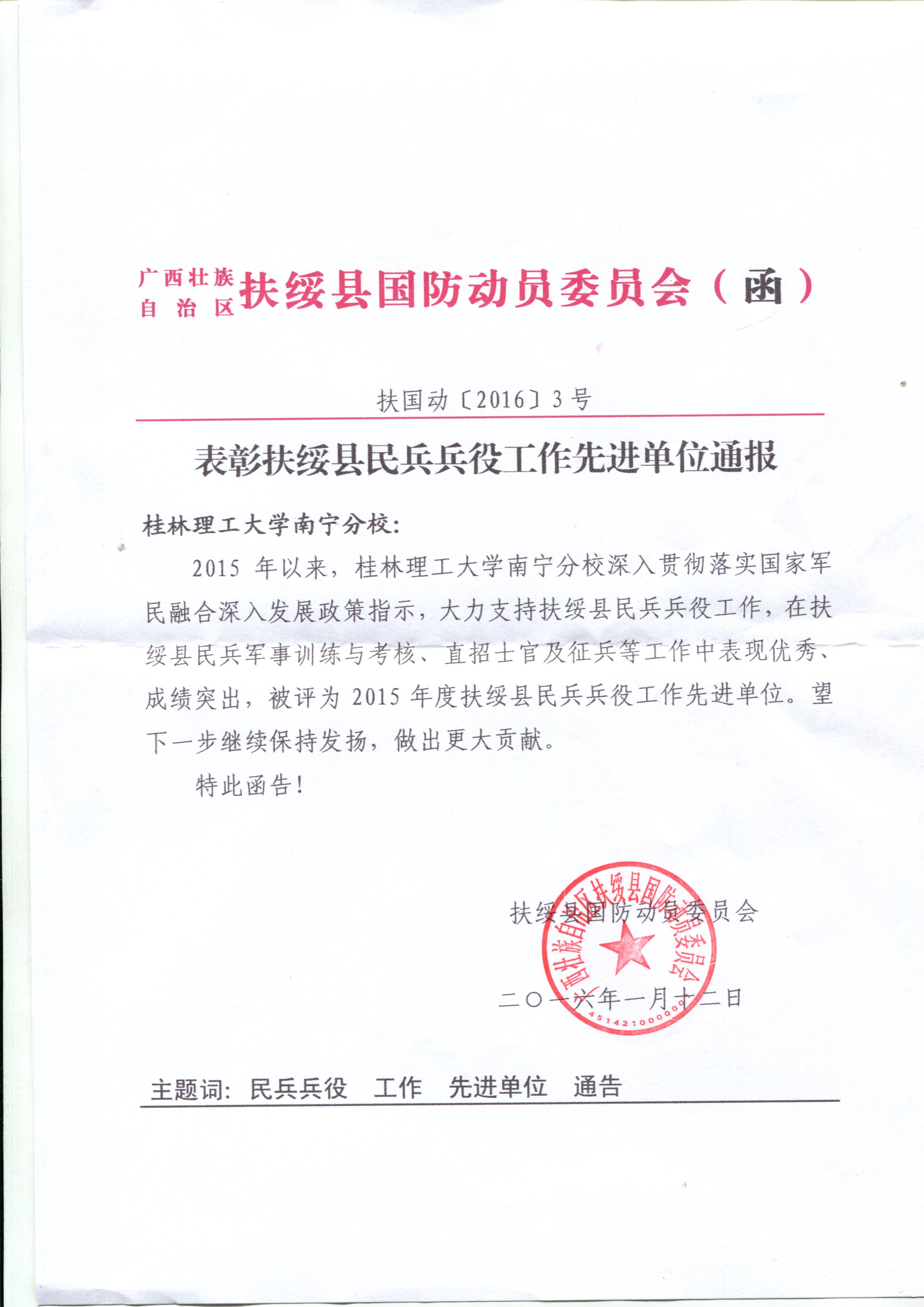 我校历来大力支持扶绥县民兵兵役工作。经过广泛宣传、积极动员、初检初审、政治审查、入伍教育、定兵欢送等环节,2015年我校共有35名大学生光荣参军入伍。被评为“扶绥县2015年度民兵兵役工作先进单位”荣誉称号。这是我校连续两年获此殊荣。