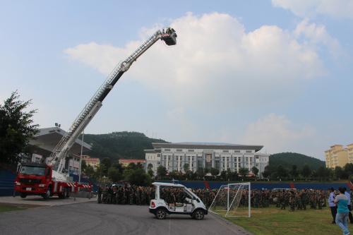 蓝警官形象生动地阐述了“全民防火,生命至上”的消防理念。根据实际情况,从火灾形成的原因及其危害、火灾易发情形及其预防措施、火场现场逃生自救方法、电器和煤气的防火与应急处理等角度对日常生活工作中的消防知识进行了详细的讲解。最后,全体2015级新生在田径场分别体验了救援云梯车、干粉灭火器灭火、消防水带出水等消防设施、设备。