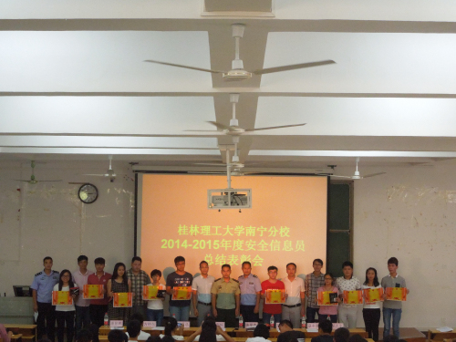| | 10月22日下午,我校举行2014年-2015年度安全信息员总结表彰暨消防知识培训会,保卫工作部陈发杰主任、学生工作部石有总和各系负责人出席并为优秀信息员颁发奖状。