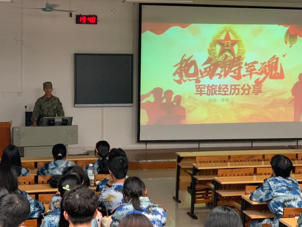 分校退役大学生谭重向同学们分享刚刚惜别的军营生活,以同龄人的视角和同学们交流参军入伍获得的成长与收获,并以他个人的视角叙述了训练趣事,展示军营魅力以及献身国防的真实感受。他的军旅叙述,发挥了青年榜样示范作用,让聆听的两百多名同学产生强烈的共鸣,进一步加深同学们对军营的了解,强化了青年大学生保家卫国的责任感和使命感。