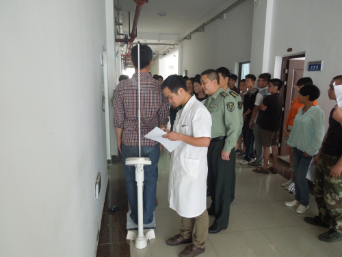 | | 为保障我校2015年夏季大学生征兵工作顺利进行,按照大学生入伍工作规划,4月27日,在保卫工作部副主任邹志友的组织下,参加本年度应征报名的40余名同学来到校医院进行体检。扶绥县武装部部长张加兵上校亲临现场指导工作。