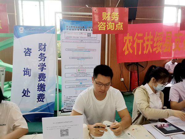 迎新当天,财务部设立了财务咨询服务点,现场为广大新生解答收费政策、学杂费缴费流程等热点问题。为方便新生办理银行卡(发卡、激活、签约)业务,财务部与农业银行扶绥县支行通力合作,特别设置银行卡办理窗口,让学生“足不出校”办业务。在做好服务的同时,为学生宣传普及金融防诈知识,帮助学生建立金融安全线,提高自我保护能力,筑牢校园安全屏障。