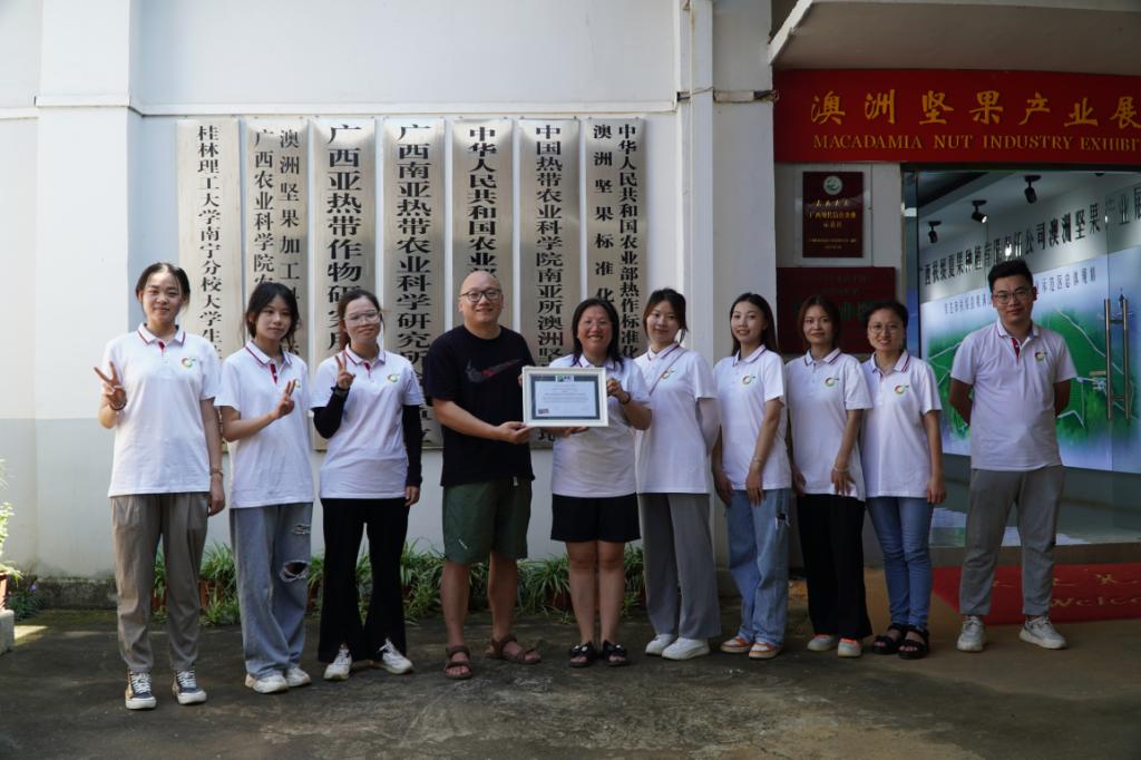 本团队主要致力于夏威夷果种植技术创新和产业增值。目前主要成果有两个,一是形成了一套完整的夏威夷果矮化密植技术与推广方案,已向8000多农户推广矮化密植技术方案,提高了土地经济效益,提前2年挂果,增加了农户收益。二是在矮化密植试验田养护过程中,对坚果树抹芽摘新丢弃的嫩芽嫩叶进行价值挖掘,针对果叶富含多酚和游离氨基酸具备制茶的条件,将其制成夏威夷果叶茶,该茶最大的特点是咖啡碱含量极低,几乎为零,满足了想喝茶又怕睡不着人群的饮茶消费需求,茶汤透亮,香气浓醇,也期待各位领导的品评反馈。目前主要以扶绥夏果公司的1.1万亩夏威夷果种植基地作为茶青的获取来源。该茶叶主要用于坚果企业内部商务接待,下一步我们将向市场推广,促进产业增值和农户增收。