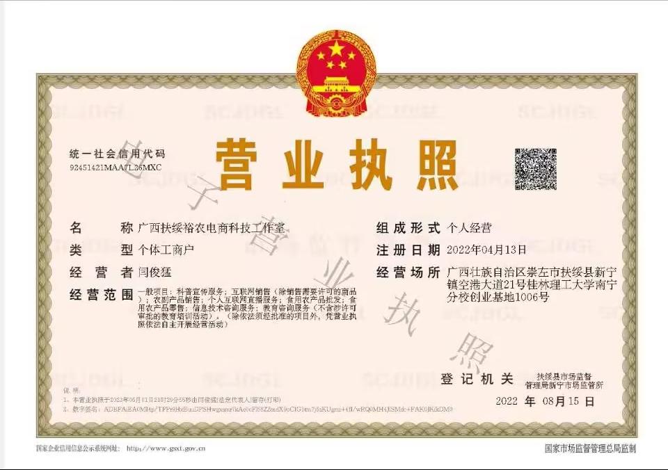 裕农电商科技工作室成立于2022年4月,位于广西壮族自治区崇左市扶绥县。本项目采取“一+二+三”的经营模式,即: