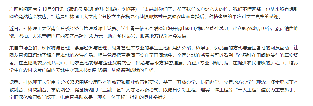 项目团队开展了公益助农销售活动,并与十余家单位建立合作关系。公益助农销售活动获人民日报、人民网、广西卫视、崇左教育报等媒体报道,取得了一定社会效益。