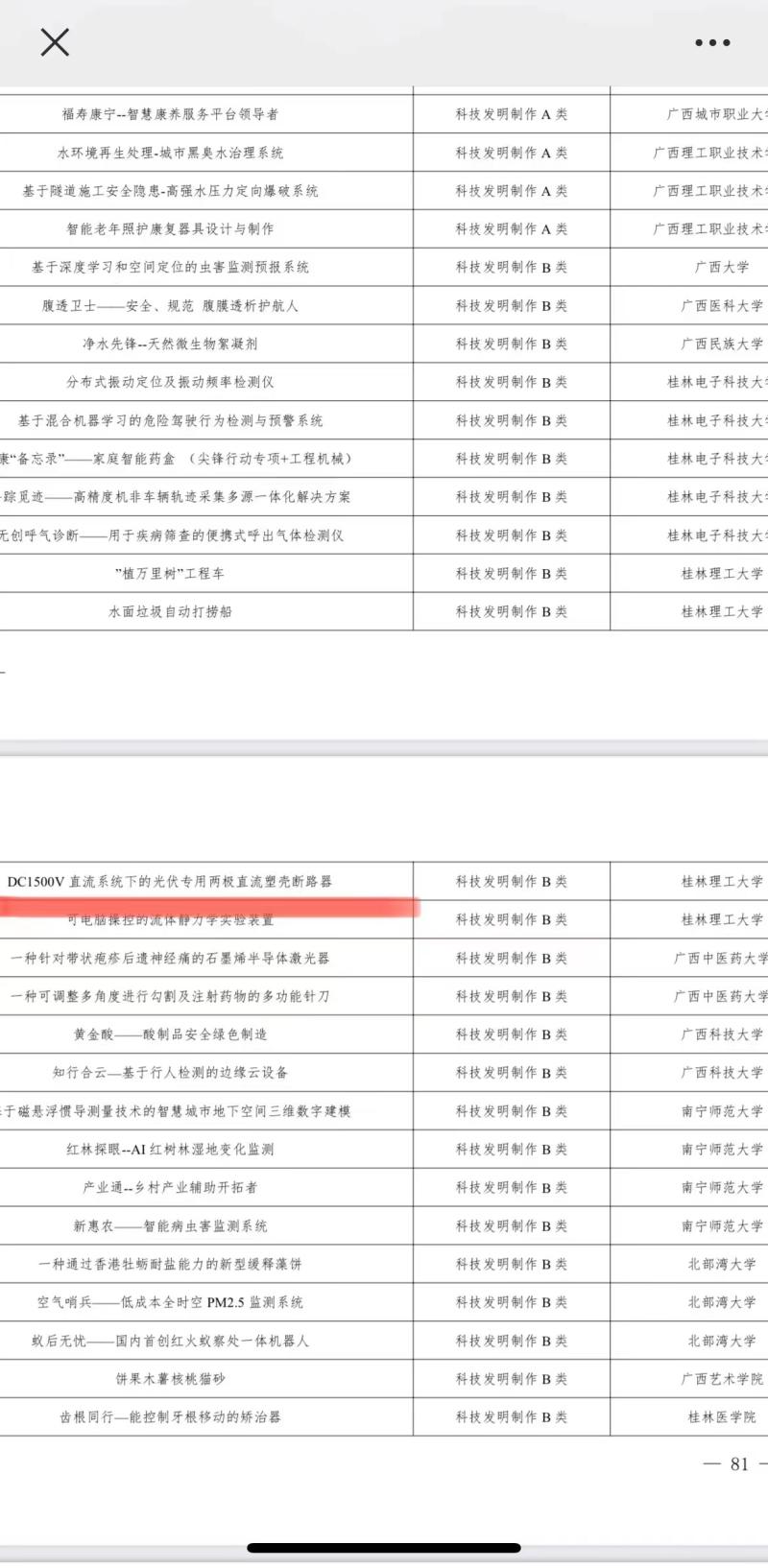 2023年5月12日至13日,由共青团广西区委、自治区教育厅、自治区科协、广西学联共同主办,桂林电子科技大学承办的第十一届“挑战杯"数字广西集团广西大学生课外学术科技作品竞赛终审决赛在桂林电子科技大学花江校区举行。此次竞赛作为一项大学生创新创业类比赛,受到了分校的高度重视,共收到六系提交的78件参赛作品。其中,自然科学学术论文12件、哲学社会科学调查报告13件、科技发明A类16件、科技发明B类37件,在太阳集团2138老师的辛勤指导以及学子的努力奋斗下,作品“DC1500V直流系统下的光伏专用两极直流塑壳断路器”荣获三等奖,这是分校学子首次获得“挑战杯”区级以上奖项,是分校在此赛事上的一次历史性的突破。
