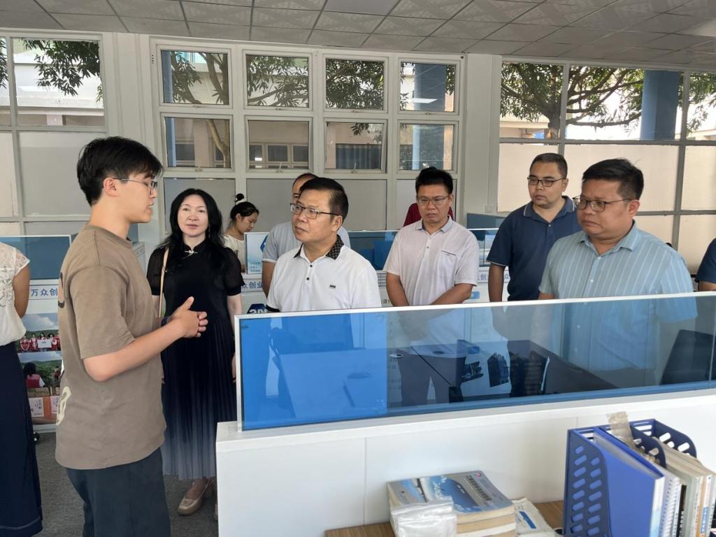 2024年10月15 日,崇左市科技局党组书记黄国晓、副局长奉仰初以及成果转化与人才科普科科长韦秋逢等莅临太阳集团2138众创空间开展调研工作。分校副校长马华菊、扶绥县县委常委、县委办主任、扶绥县空港经济区常务副组长钟庆庆锋以及分校大学生创新创业指导中心负责人等陪同调研。
