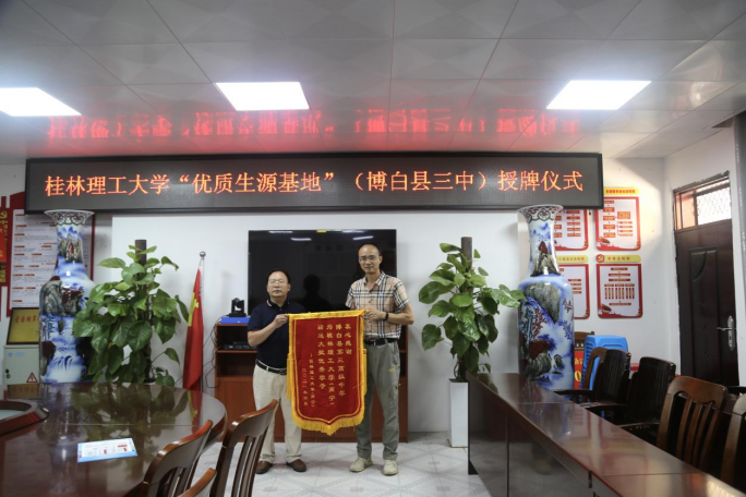 座谈会后,周主任代表学校对博白三中“优质生源基地”进行授牌,赠与锦旗及感谢信。