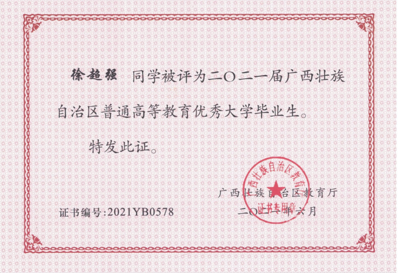 获奖情况:曾获国家奖学金1次、国家励志奖学金1次、校特等奖学金3次,分校级第一届思政实践课程优秀案例评选一等奖,第三届全国大学生环保知识竞赛“优秀奖”、第四届全国大学生环保知识竞赛“优秀奖”,多次获得“三好学生”、“优秀团员”、“青年志愿者活动先进个人”。