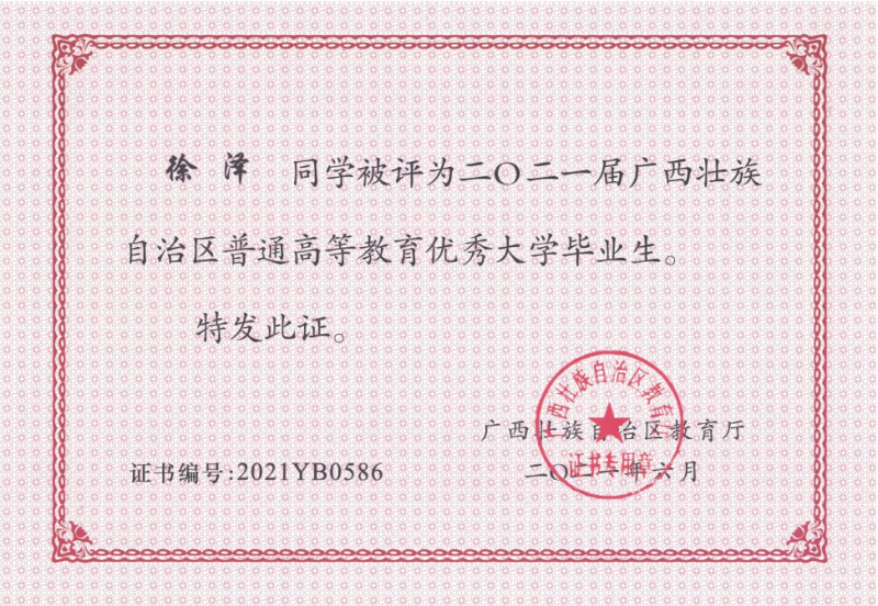 获奖情况:曾获国家励志奖学金1次,校级奖学金2次,自治区级大学生第四届“爱我国防”演讲比赛三等奖校级奖学金2次,自治区级第二届“信仰的力量”党史微视频大赛最佳人气奖,南宁市“明德杯”演讲比赛三等奖,崇左市“科技引领时代”主题演讲比赛三等奖,崇左市“新时代的边疆有我在”主题宣讲大赛优秀奖,分校级“优秀先进个人”,“党员先锋”,“自强之星”,多次获得“优秀学生干部”,“三好学生”荣誉称号。