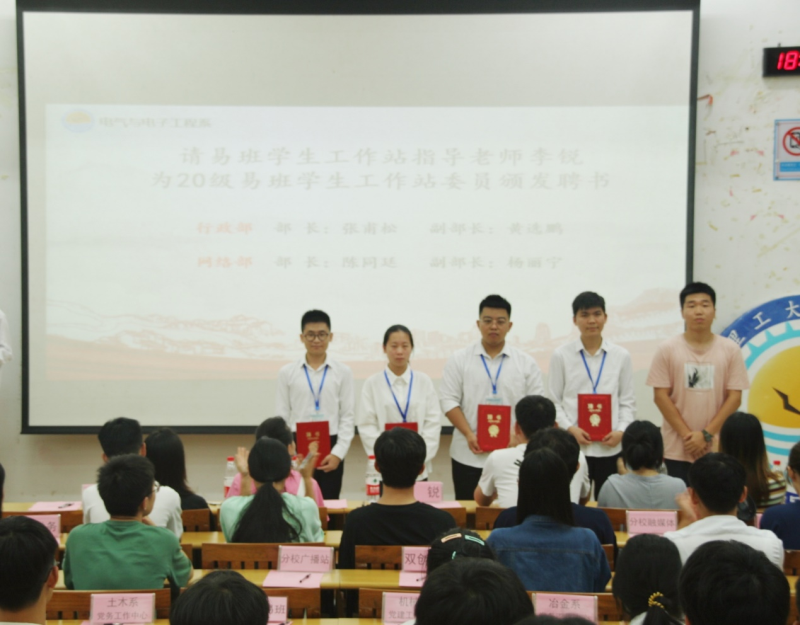在国歌的演凑中,大会正式开始。首先是参会人员共同观看换届视频,这有着指导老师和21级干事对20级干事的祝福与期望。随后,由指导老师为各团体委员颁发聘书,上一届委员为新一届委员授牌。