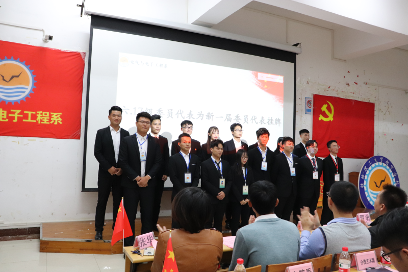 会议一共分为八项,会议第一项,由主持人介绍会议领导和嘉宾,随后全体奏唱《共青团团歌》。会议第二项,播放换届视频展示了17级、18级五大团体成员的风采及各团体干事对17级五大团体学长学姐们的祝福,最后就是老师给17级委员的寄语和对18级新任干事在未来工作的期盼。会议第三项由老师们为17级委员颁发聘书,红布之上的是对委员们无私奉献工作的肯定。会议第四项,由团总支副书记张岚钦对过去一年工作的总结发言和表达了对学生会的不舍之情及对下一届学生会干事工作的期望。会议第五项,由各团体负责人宣读各干事名单。会议第六项五大团体各派出两位代表为新一任委员挂牌。会议第七项,五大团体18级委员代表进行了发言,发言表达了对17级同学的祝福等。会议进行到第八项,由甘锦琛老师作大会总结,在肯定了上一届团总支学生会及各团体工作的同时,对新一届团总支学生会成员及各团体的工作提出了要求,要求全体学生会成员学习学长学姐们无私奉献、兢兢业业的工作精神,做到团结同学、认真负责、共同进步,也将系部学生会工作越做越好。