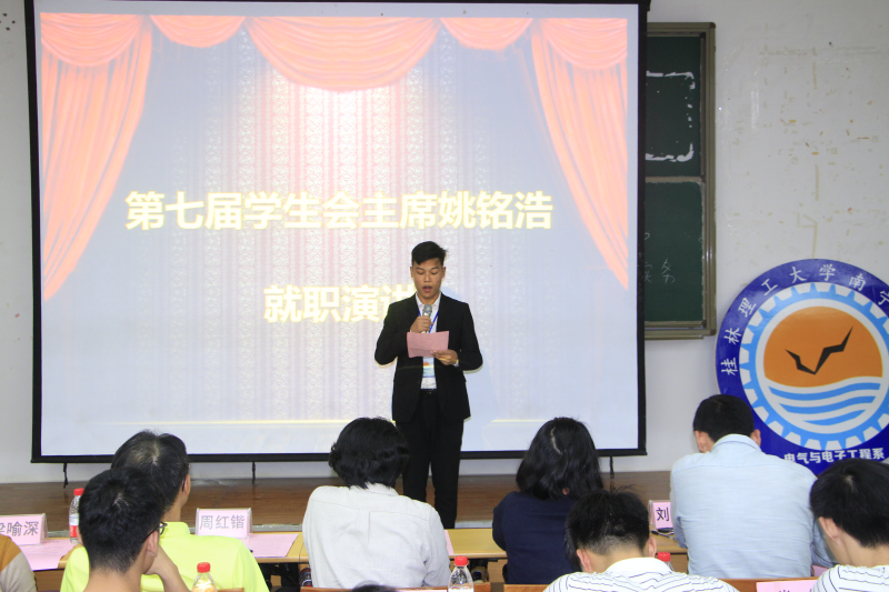 伴随着庄严的国歌声,大会拉开了序幕。大会首先播放了换届视频,视频讲述了17级学生会成员和老师对16级学生会学长学姐们的祝福与期望,讲述了16级学长学姐们对团总支、学生会的不舍与期盼。在热烈的掌声中,梁喻深老师、章丰慧老师、刘恒老师、梁宇老师、李梅清老师分别为16级委员颁发聘书,学生会主席魏博的发言,他总结了团总支学生会过去一年里所做的额努力,表达了自己对学生会的感恩之情、不舍之情,以及对下一届学生会干事的期望。随后梁喻深老师宣读团总支、学生会新一届委员名单,16级干部为17级干部挂牌,将学生会工作火炬郑重地交到新一届委员手上。新任学生会主席姚铭浩发言,他表示会用实际行动把电气系学生会做的更好。