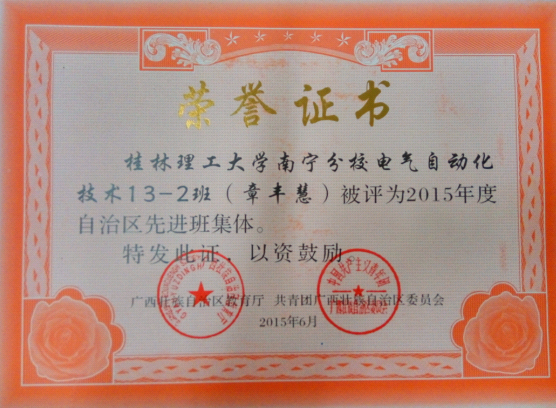 电气13-2班荣获2015年度自治区“先进班集体”称号