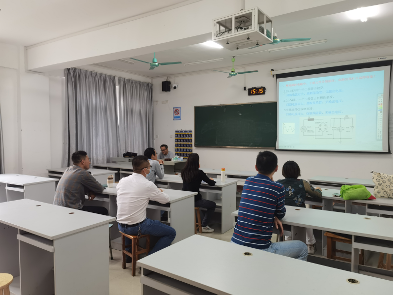 以农杰老师主讲的《电子技术基础》课程为例进行磨课和集体研讨。本次磨课从全组成员集体听课开始,在讲课结束后,农老师对自己本轮授课进行反思,听课者进行讨论。老师们对农杰老师在讲授过程中存在的问题进行了点评,在磨课活动中,电信教研室教师相互启迪、相互借鉴,增进交流。通过磨课活动,对提高教学水平与质量起到了积极推动作用。