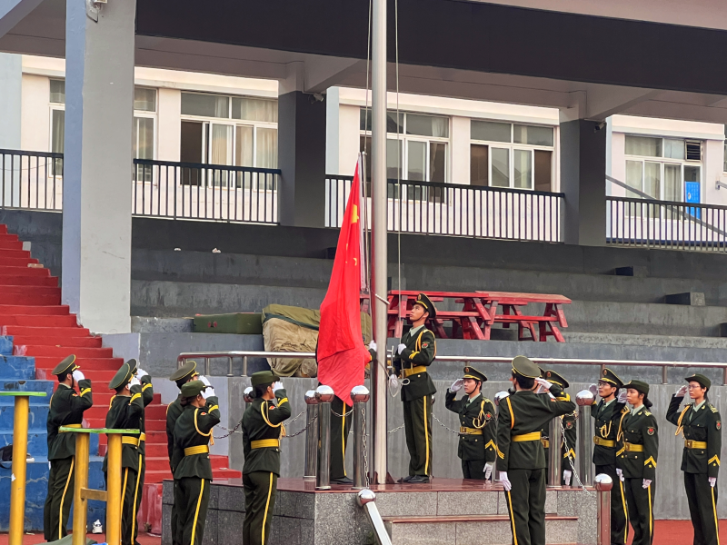 于7点整,主持人宣布“升旗仪式现在开始”,在全体师生注视下,气势磅礴的国旗护卫队护送五星红旗进场,随后伴随着《义勇军进行曲》全体师生向国旗行注目礼,五星红旗缓缓升起,随风飘扬。升旗结束,胡宇老师作国旗下的讲话,向同学们提出衷心的建议和祝福。
