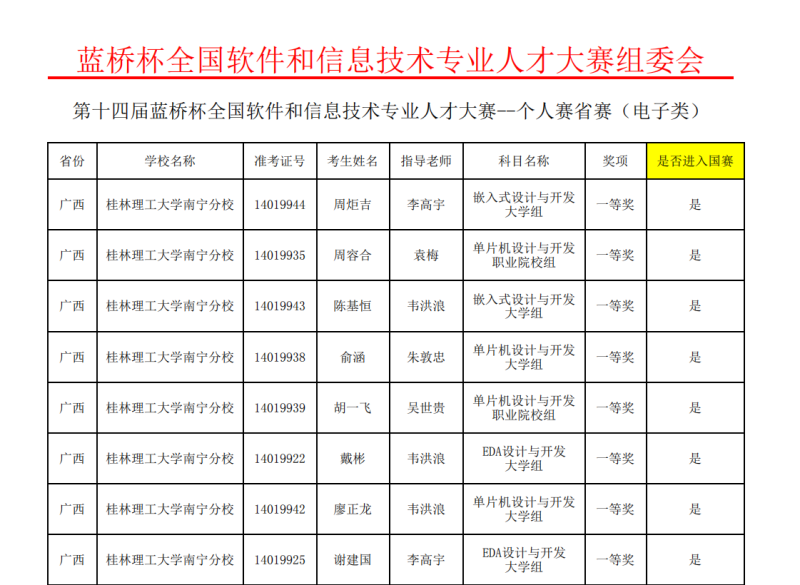 2023年4月8日,第十四届“蓝桥杯”全国软件和信息技术专业人才大赛广西区赛圆满落幕。我系共计20名学子参加此次大赛,凭借出色的专业素质和技能勇创佳绩,斩获一等奖11项、二等奖4项、三等奖4项,其中共计11名学子入围全国总决赛。