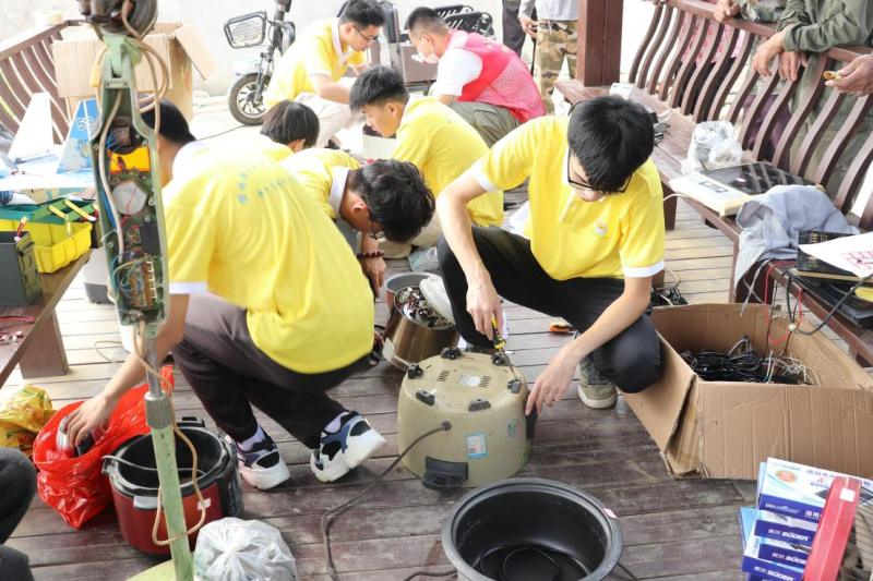 家电义务维修。一字、十字、三角螺丝刀来回切换,电容、电机、万用表纷纷上场。党员志愿者认真查找电器故障,熟练拆卸螺丝、检测、焊接、接线、换零件、重装、测试。他们用专业技能维修好一台台电器,为群众讲解家电日常维护保养知识。