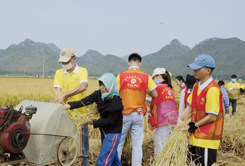 为群众抢收稻谷。为缓解部分村民劳动力不足秋收难的问题,师生党员们撸起袖子,挥舞镰刀,收割脱粒,装袋搬运。大家挥汗如雨,齐心协力,热火朝天,体验着农事劳作的艰辛和丰收的喜悦。