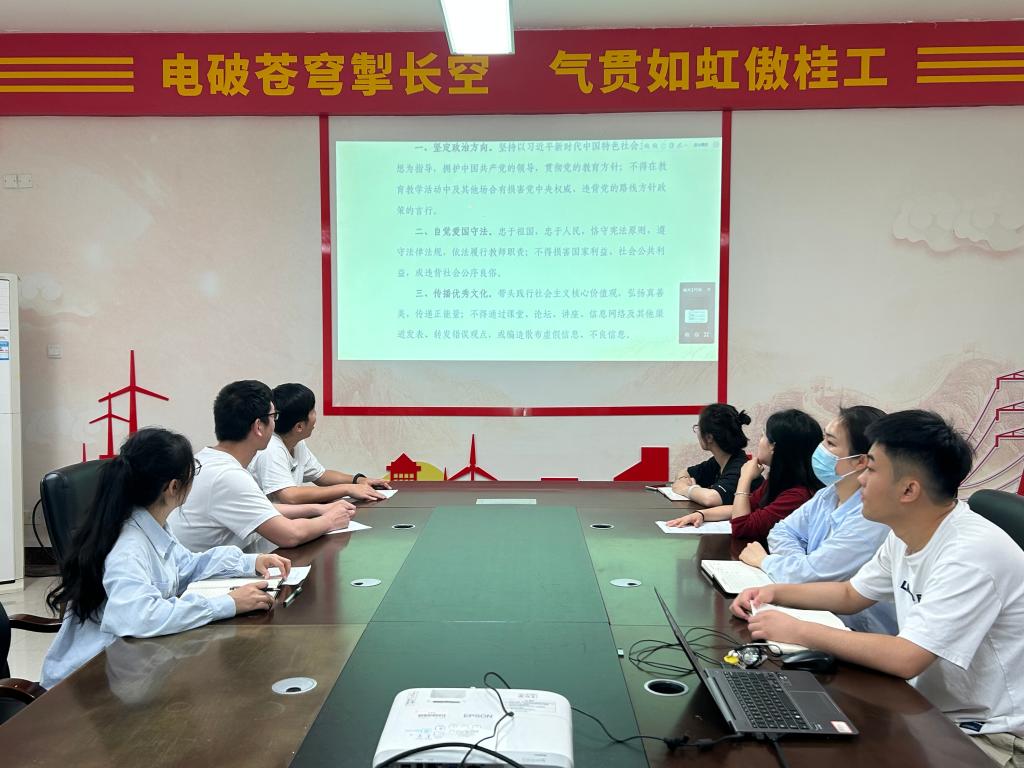 会上,全体教职工集中学习《新时代高校教师职业行为十项准则》、《广西高校教师职业道德考核办法》、《广西高效教师职业道德负面清单和失范行为处理指导意见》以及学校《师德师风负面清单和失范行为处理办法》、《太阳集团2138教师职业道德考核办法》等师德师风建设相关文件精神;随后,各教研室针对师德师风相关文件进行深入研讨,并学习了关于师德失范问题的相关典型案例,以案示警,加强教育,引导广大教师自警、自省、自重。