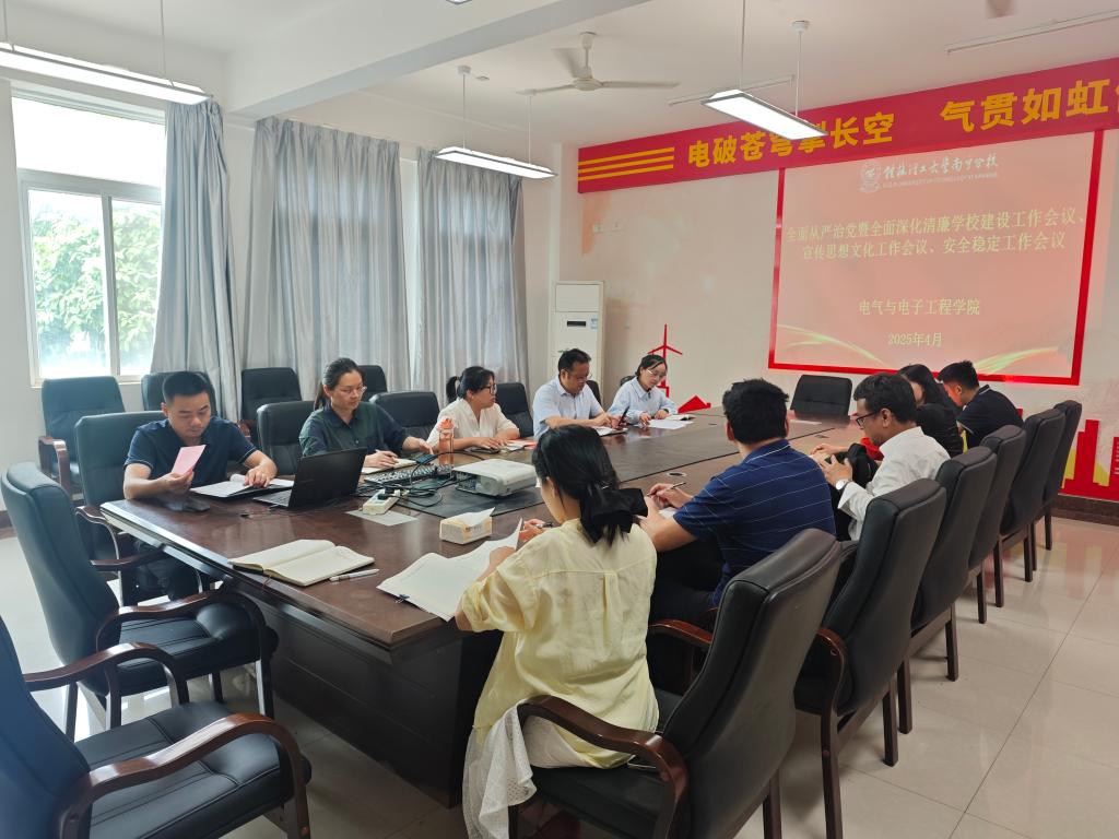 2025年4月25日,我院在4208会议室召开全面从严治党暨全面深化清廉学校建设工作会议、宣传思想文化工作会议、安全稳定工作会议,学院领导班子、各教研室主任参加会议,学院党委书记黄薇薇主持会议。