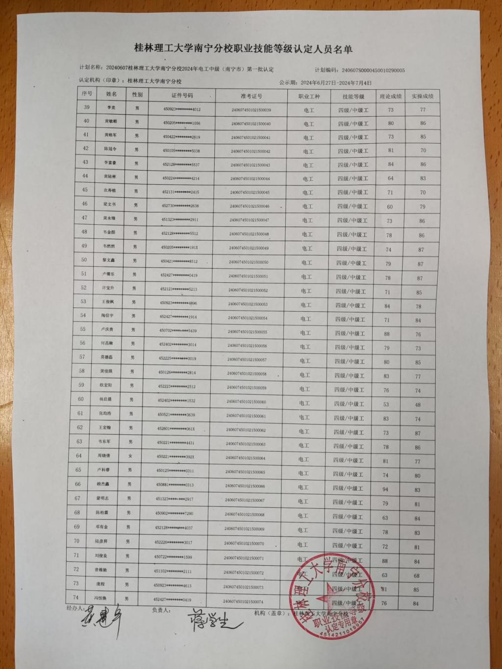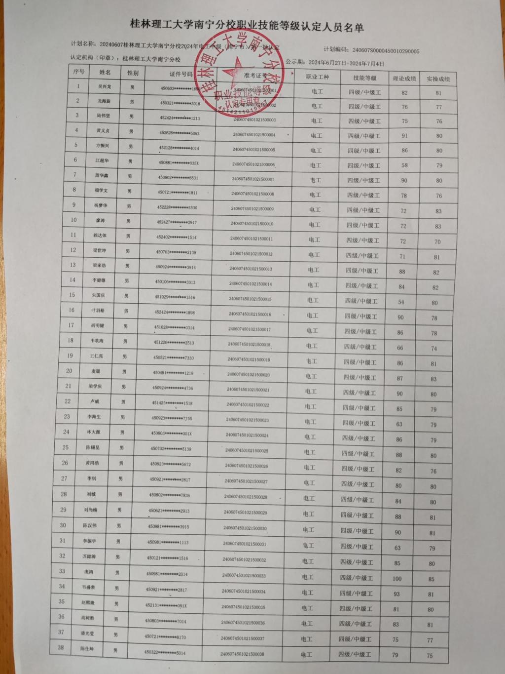 根据《广西壮族自治区人力资源和社会保障厅关于开展社会培训评价组织职业技能等级认定试点工作的通知》(桂人社函(2020)203号)等有关文件要求,为确保职业技能等级认定的公平公正,现对太阳集团21382024年6月20-21日74人参加电工(四级/中级工)考试,合格人数70人的职业技能等级认定人员成绩进行公示,公示期为本公示发布之日起5个工作日:2023年6月27日—7月4日。