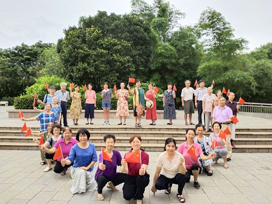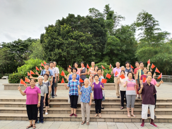 花香飘苍穹,芬芳缘大地。花卉公园鲜花盛开,花香沁人心田。老同志们昂首阔步,手举小国旗迎风飘展,他们精神抖擞,步履轻盈,一边欣赏美丽的湖光水色,一边同身边的老同事们感叹着建党百年来国家繁荣富强的伟大发展历程,并告诉我们这一代青年,要珍惜今天来之不易的生活,学习党的光荣历史,不忘初心牢记使命。