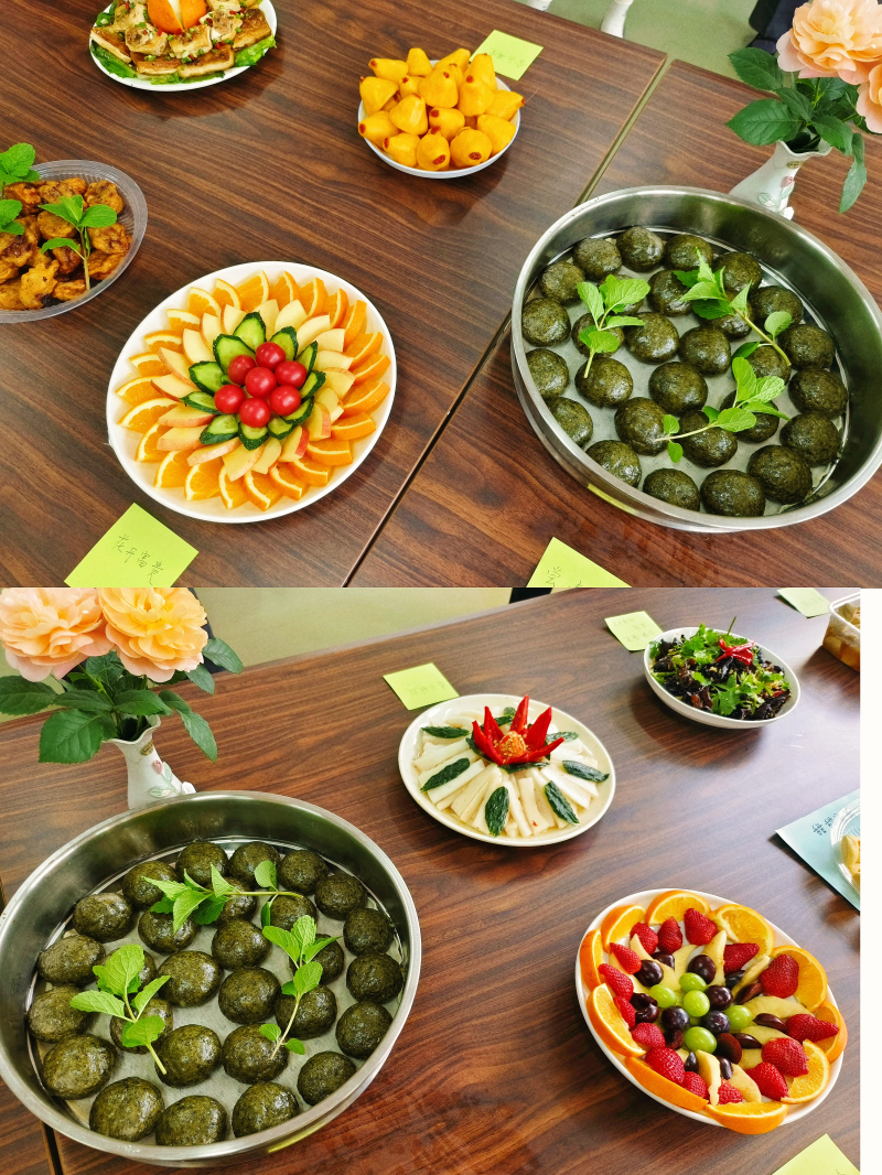 参加活动的退休女教职工充分发挥各自的厨艺,提前准备了五彩缤纷的菜品参加竞赛,美味“尝春—艾粑粑”、巧手“炸春—蓝刀鱼”、特色香酥“蕉”、精致“红蓝、绿里”凉拌菜、满园春色花开富贵、醉美草莓甜心……一道道色香味美的菜肴、面点、甜品,勾起人的味蕾和食欲,为在场的所有人展现了一场饕餮盛宴,职工之家弥漫着美食香味和退休女教职工的欢声笑语。