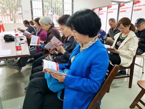 退休老党员们翻阅“不忘初心、牢记使命”主题教育知识手册