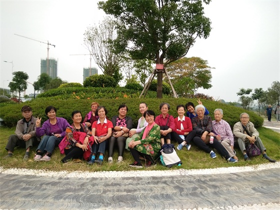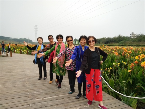 清风送爽丹桂香,槿艳繁花满树红,红艳的朱槿花迎风招展迎接我们的到来。退休教职工们兴致勃勃地漫步在木制的临水步道上,绿油油的草坪顺着河岸延伸开来,成片的美人蕉,形成了片片色彩斑斓的花海,河水清可见底,微风吹过,带来青草、鲜花的芬芳。退休教职工们个个精神焕发,三三两两,不紧不慢,结伴徜徉在花海美景中,停驻凉亭、水车、木桥旁,摆个姿势,留下美景,嗅着花香,赏着美景,喜笑颜开,其乐无穷。累了,大家便倚靠围栏眺望远观,感受绿色生态清新的气息。