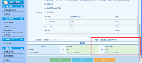 3.分工会主席登录工会信息管理系统,点击“活动审核”、“进入审核”,“同意”,“确定”提交分校工会审批