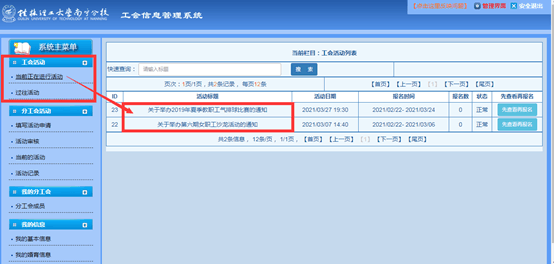 2.查看系统主菜单中“分校工会活动”, 查看“当前正在进行的活动”,有集体和个人活动两类。