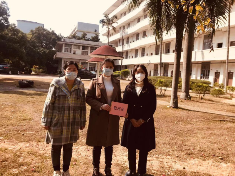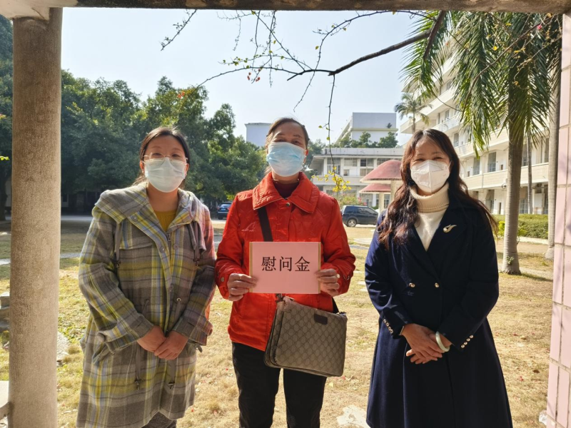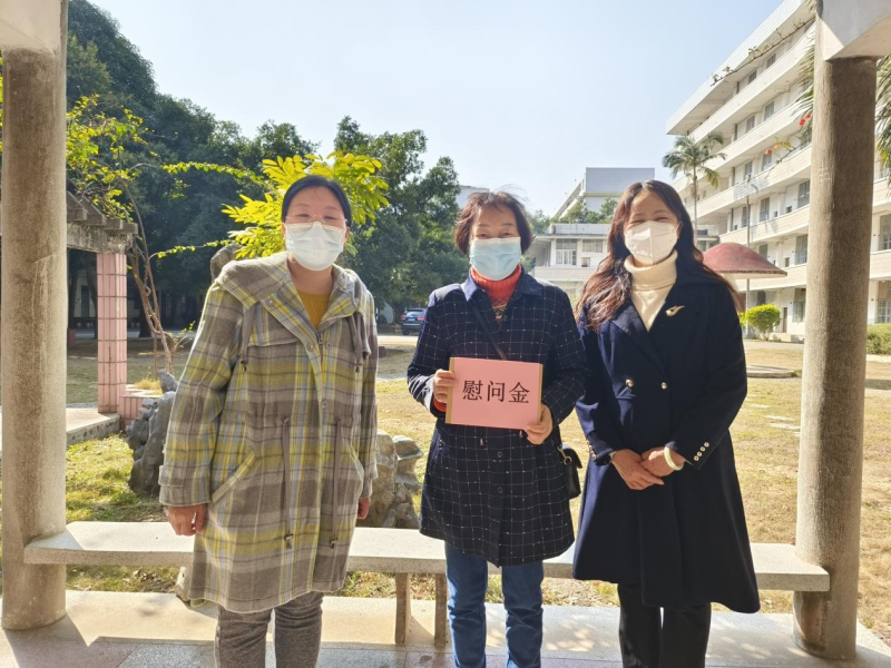太阳集团2138副校长、工会主席陈东莲(右一)、工会副主席黄薇薇(左一)走访慰问在职困难教职工代表