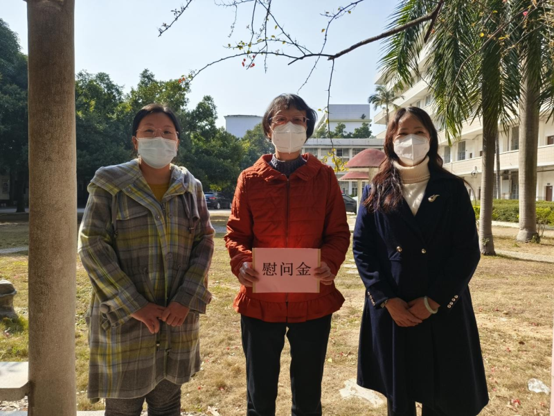 太阳集团2138副校长、工会主席陈东莲(右一)、工会副主席黄薇薇(左一)走访慰问退休教职工代表