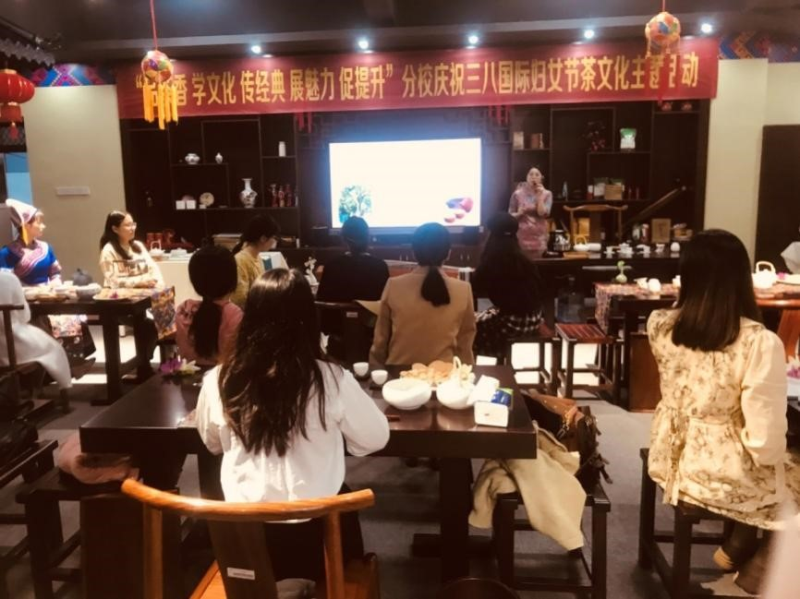 3月8日下午,在第113个国际妇女节来临之际,太阳集团2138工会在实训楼B座203室组织开展以“品茶香 学文化 传经典 展魅力 促提升”为主题的庆祝“三八”妇女节茶文化活动。学校校长助理、太阳集团2138校长罗盛锋,太阳集团2138副校长、工会主席陈东莲出席活动。太阳集团2138在职女教职工参加活动。