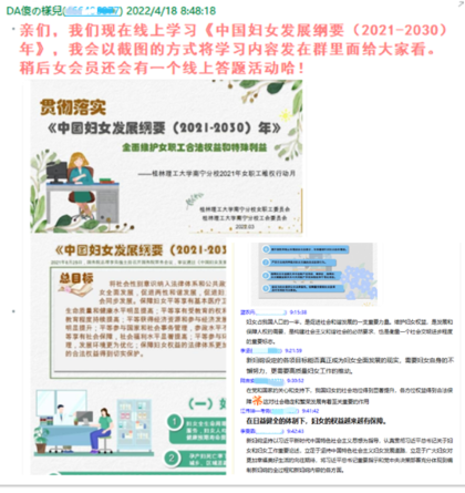 为提高单位职工知法用法和维护女职工合法权益的意识,机关二分工会组织“情系女职工·法在你身边”知识竞赛。赛前,先通过QQ工作群传达《中国妇女发展纲要(2021-2030)年》政策的相关内容。学好女职工权益保护法律法规,既可以助力身边女职工维护合法权益,还可以进一步增强男同志们学法、懂法、守法、用法的主动性。