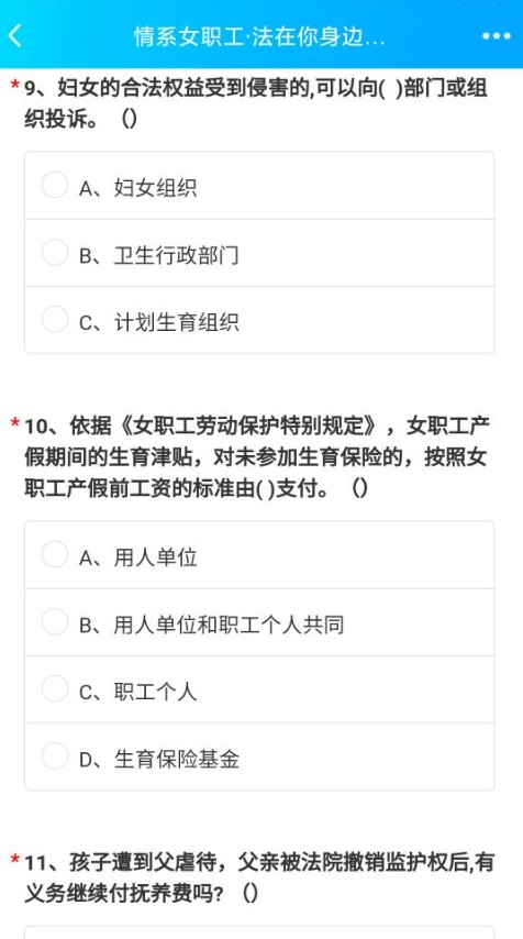 本次答题内容涉及《妇女权益保障法》、《女职工劳动保护特别规定》、《婚姻法》、《中华人民共和国民法典》等有关女职工权益维护方面的法律法规,内容丰富、知识面广。活动期间,全系女职工积极参与,有效提高了女职工的思想认识,强化了法律意识。