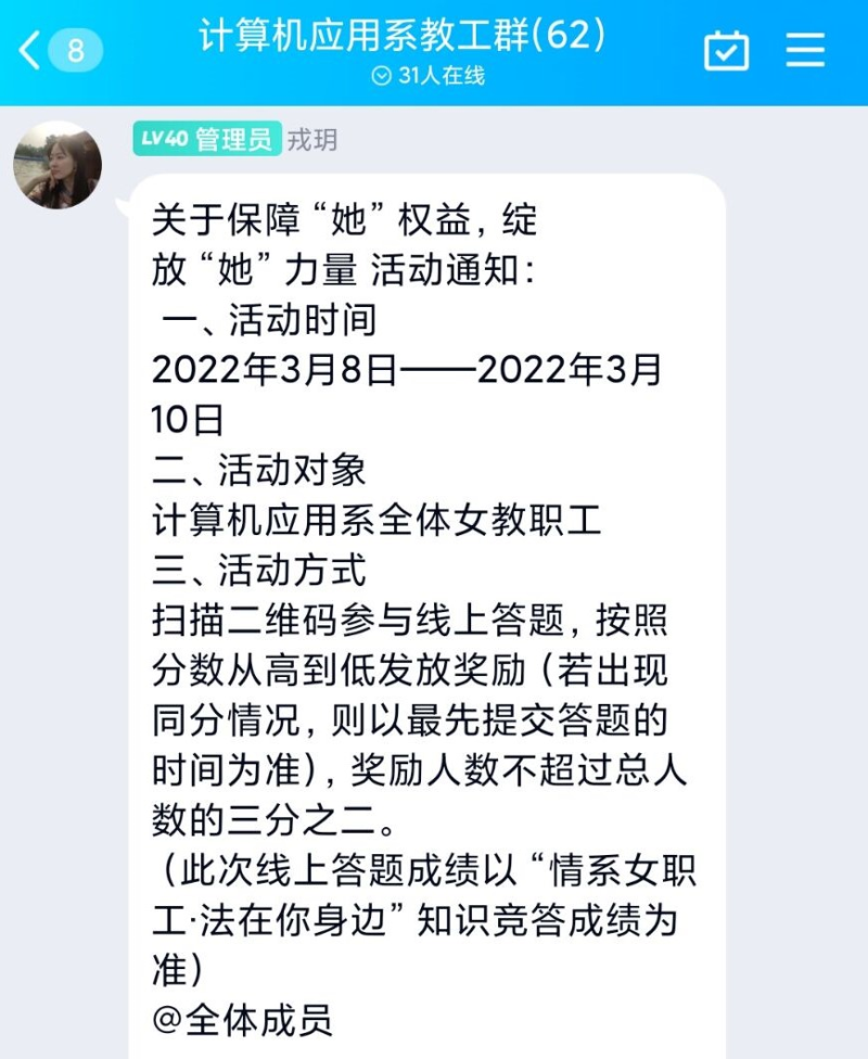 阳春三月,春暖花开。3月8日至10日,计算机应用系分工会以喜迎“三八”妇女节为契机,组织全系女职工开展了以“保障‘她’权益,绽放‘她’力量”为主题的线上答题活动。