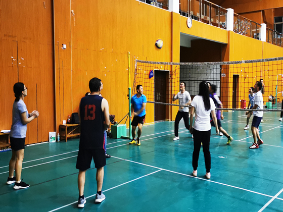比赛通过抽签方式组成4支参赛队,以单循环淘汰形式进行。赛场上,老师们本着“友谊第一、比赛第二”的原则,在球场上各队队员们你来我往,互有攻防、拦网、吊球、扣杀、打得相当精彩,啦啦队员也在不遗余力的在为各队加油。赛场上每队都打得酣畅淋漓、难分高低。尽管比赛紧张,运动强度大,但大家都表现出饱满的精神状态和顽强拼搏的竞技精神。