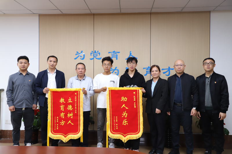 经过详细交流,了解到事情原委。11月2日晚,罗家顺、法智源两位同学在返校途中遇到钟汉群老人驾驶的电动三轮车侧翻,老人被压三轮车下,脚部血流不止。两位同学见状第一时间拨打120,并配合急救中心将受伤老人送到扶绥县中医院急诊部,同时联系老人家属说明情况。事后,钟汉群老人及家属通过多方面打听,了解到救助他的是太阳集团2138学生。于是,委托女儿和侄子送来锦旗,对两位同学助人为乐精神表示感谢,对太阳集团2138培养出这么优秀的学生表示赞扬。